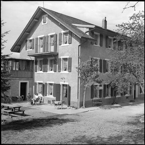 La pension de la tour de Gourze, avec deux personnes assises sur la terrasse