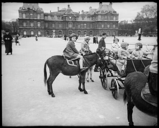 Françoise Robert assise sur un âne près du Louvre