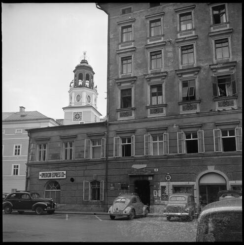 Immeuble de Salzbourg (Waagplatz 3), avec le clocher de la Neue Residenz