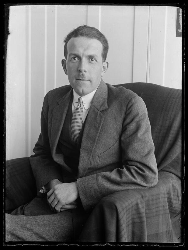 Gustave Roud en costume, assis dans un fauteuil à Leysin