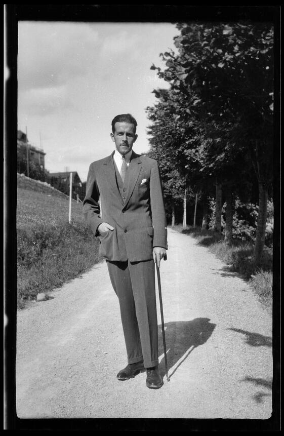 Gustave Roud, de face, sur une route de campagne, une canne à la main