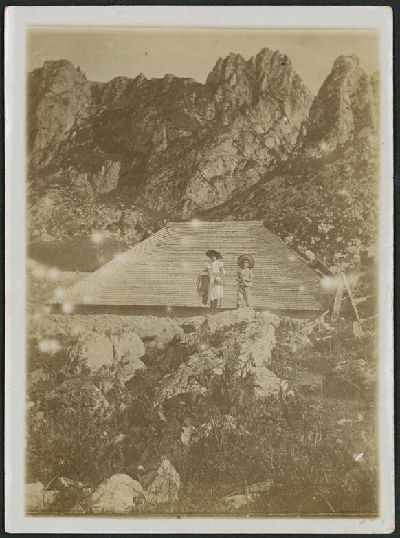 Gustave et Madeleine Roud enfants, debout sur des rochers devant le toit d'un bâtiment en montagne