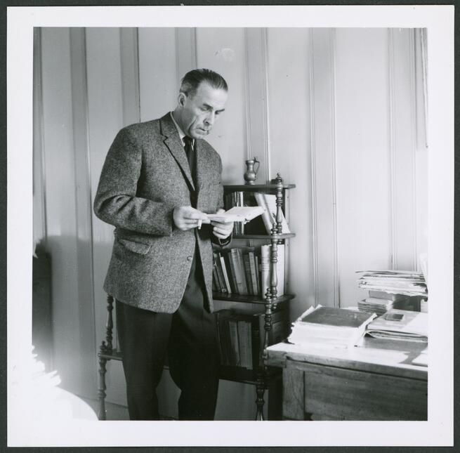 Gustave Roud lisant un livre, une cigarette à la main, appuyé contre une bibliothèque près d'un bureau dans sa maison