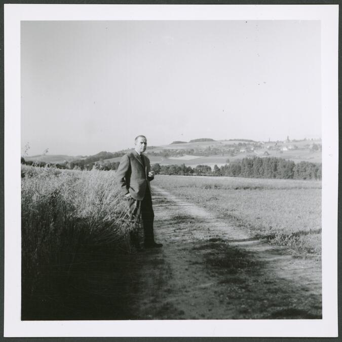 Gustave Roud sur un chemin de campagne, une cigarette à la main