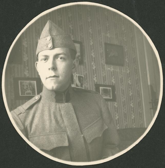 Autoportrait de Gustave Roud, en uniforme, à l'intérieur de sa maison