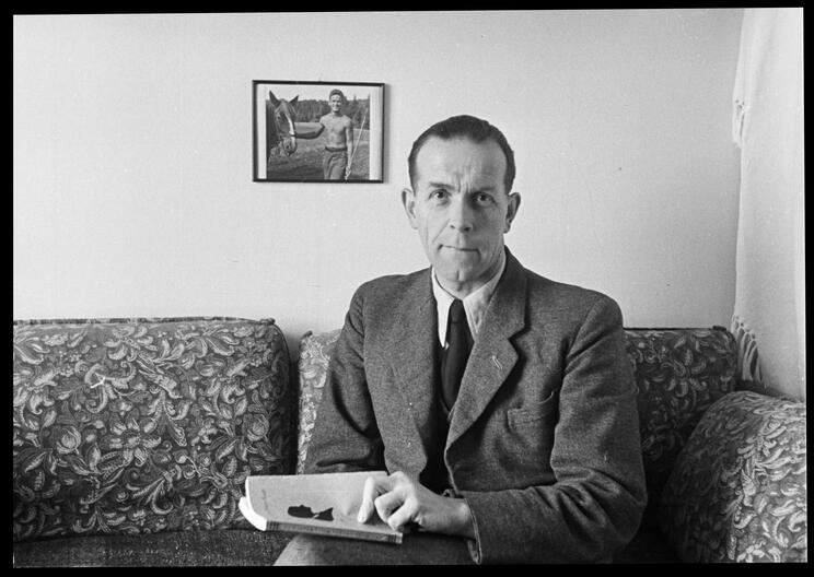 Gustave Roud assis sur un canapé dans sa maison, tenant un livre, devant une photographie d'André Ramseyer