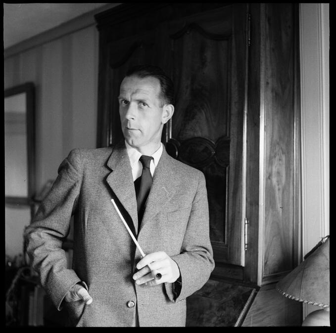 Gustave Roud posant à côté d’une armoire dans sa maison, une pipe à la main