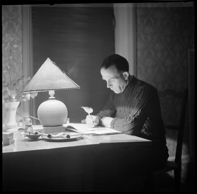 Gustave Roud assis à sa table de travail, écrivant avec une plume à la lumière d'une lampe