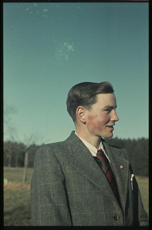René Balsiger de profil, en costume-cravate, dans un pré
