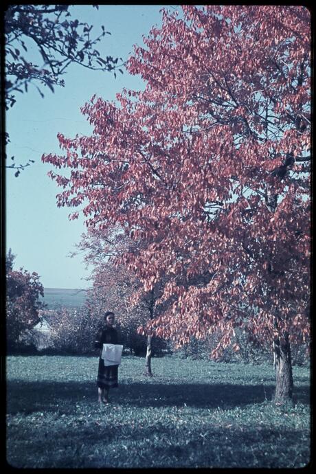 Madeleine Roud, tenant un linge, debout dans son verger en automne