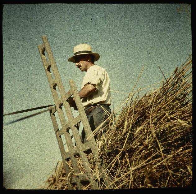 Olivier Cherpillod debout sur un char de paille, tenant des rênes